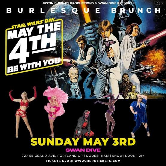 Back to All Events Star Wars Day May the 4th Be With You Burlesque Brunch Sunday, May 3, 2026 11:00 AM 2:00 PM Swan Dive 727 Southeast Grand Avenue Portland, OR, 97214 United States (map) Google Calendar ICS Celebrate May the 4th one day early with a morning of high-energy burlesque performances, delicious brunch bites, and intergalactic vibes at the Swan Dive’s Star Wars Burlesque Brunch. Learn more